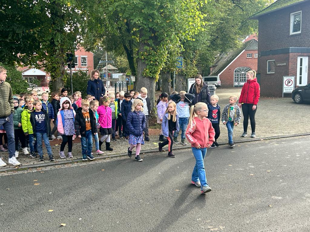 Wir sprachen darüber, welche Verkehrsmittel wir auf dem Weg zur Schule nutzen oder ob unsere eigenen Füße uns zur Schule tragen. Wir tauschten uns über unsere Schulwege aus und ergründeten die Vor-und Nachteile der genutzten Verkehrsmittel. Wir haben an mehreren Straßen in der Nähe der Schule geübt, wie wir sicher die Straße überqueren können. Gemeinsam mit dem Polizisten Herrn Franzen haben wir geprüft, an welchen Stellen wir die Straße gut einsehen und so sicherer überqueren können. Hier wurden gelbe Füße aufgesprüht. Außerdem überprüften die Polizisten alle Fahrräder auf Verkehrssicherheit, damit wir sicher mit dem Fahrrad zur Schule kommen. Zum Schluss machten wir noch einen tollen Spaziergang zu einer Schulexpress-Haltestelle und anschließend zum nahegelegenen Spielplatz. Wir haben ausgelassen zusammen gespielt! Das war ein schöner Tag!