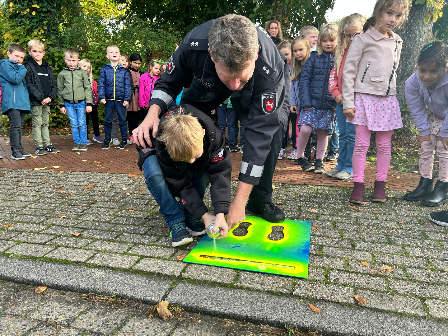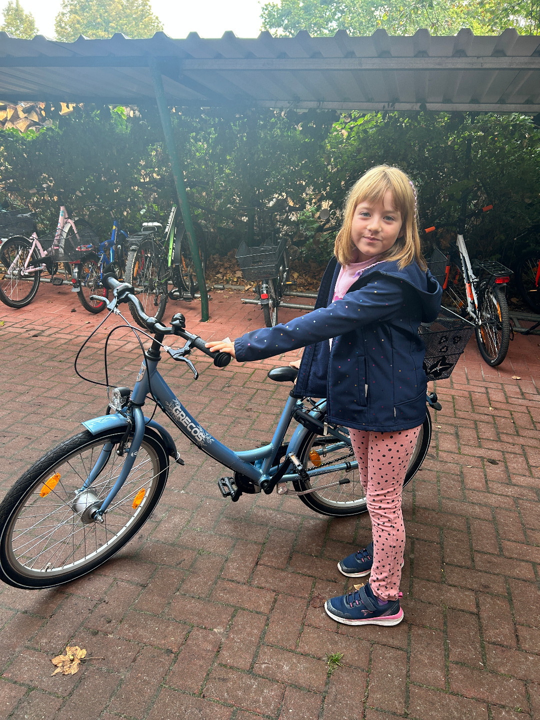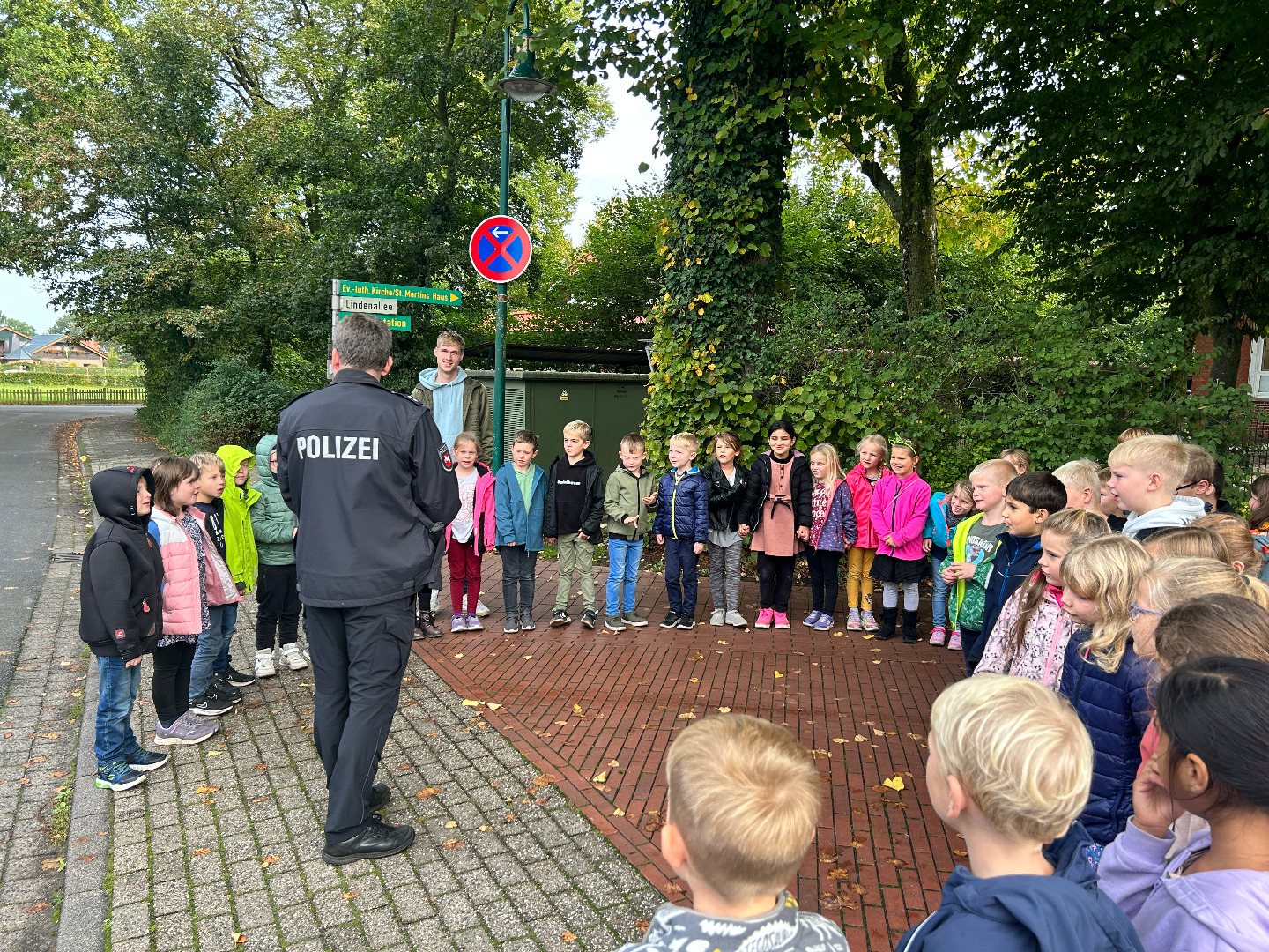 Wir sprachen darüber, welche Verkehrsmittel wir auf dem Weg zur Schule nutzen oder ob unsere eigenen Füße uns zur Schule tragen. Wir tauschten uns über unsere Schulwege aus und ergründeten die Vor-und Nachteile der genutzten Verkehrsmittel. Wir haben an mehreren Straßen in der Nähe der Schule geübt, wie wir sicher die Straße überqueren können. Gemeinsam mit dem Polizisten Herrn Franzen haben wir geprüft, an welchen Stellen wir die Straße gut einsehen und so sicherer überqueren können. Hier wurden gelbe Füße aufgesprüht. Außerdem überprüften die Polizisten alle Fahrräder auf Verkehrssicherheit, damit wir sicher mit dem Fahrrad zur Schule kommen. Zum Schluss machten wir noch einen tollen Spaziergang zu einer Schulexpress-Haltestelle und anschließend zum nahegelegenen Spielplatz. Wir haben ausgelassen zusammen gespielt! Das war ein schöner Tag!