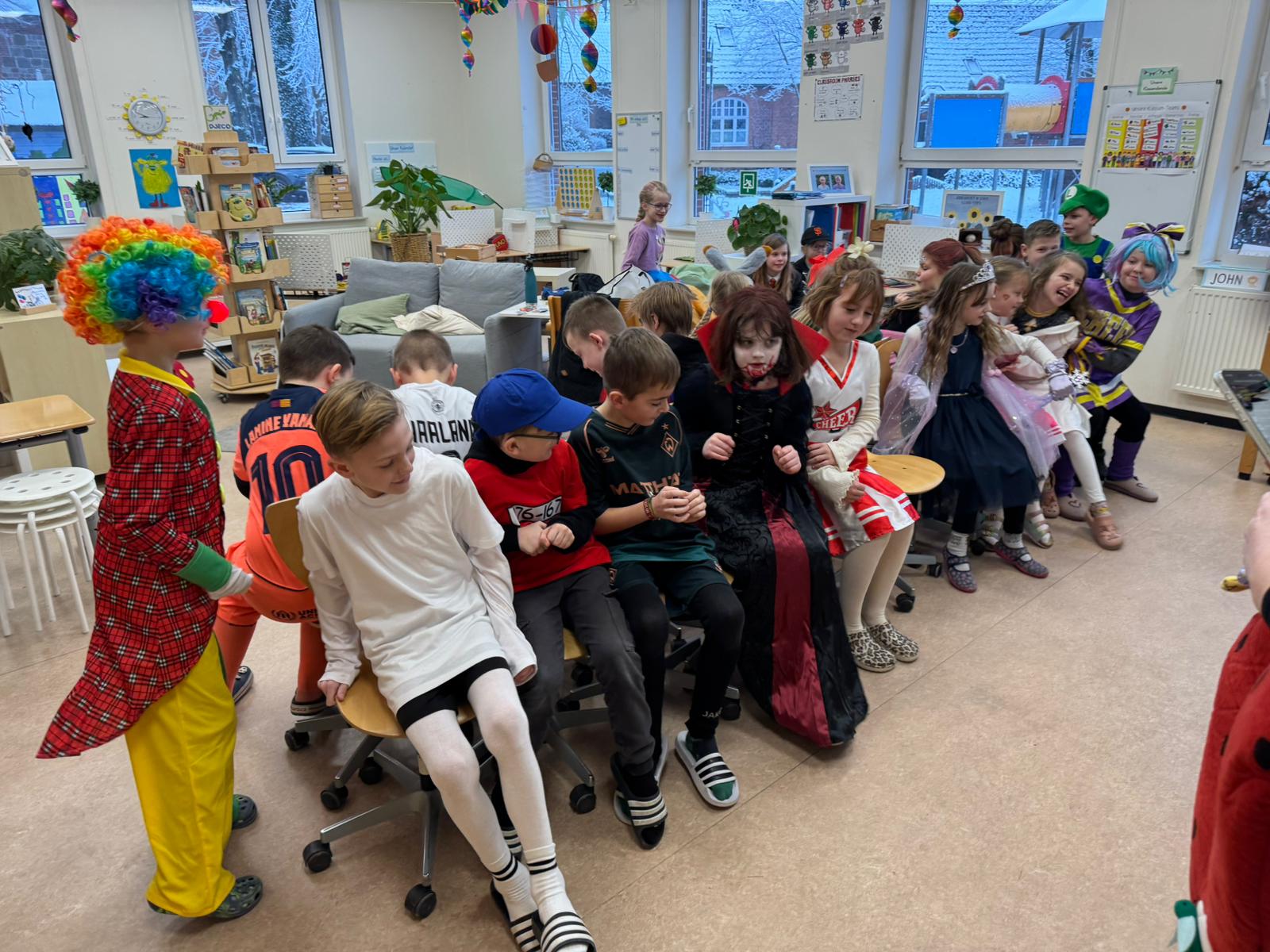 In der 3c wurde Karneval als bunter und fröhlicher Tag gefeiert: Alle hatten gute Laune und es wurde getanzt, gespielt und viel gelacht. Überall gab es tolle Kostüme zu sehen – die kreativen Verkleidungen sorgten für staunende Gesichter und beste Laune. Außerdem haben wir Konfettikanonen gebastelt, was für noch mehr Trubel und Spaß gesorgt hat. Ein besonderes Highlight war die Disco in der Aula: Zu mitreißender Musik wurde ausgelassen getanzt, gesungen und gefeiert. Insgesamt war es ein rundum gelungener Karnevalstag mit großartiger Stimmung. Wir freuen uns schon auf das nächste Jahr!