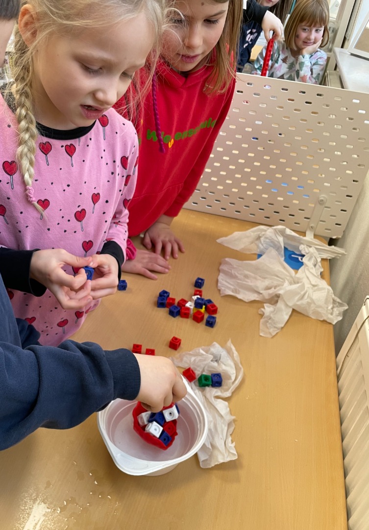 In den letzten Woche haben wir im Sachunterricht untersucht, welche Dinge schwimmen und welche Dinge sinken. Dabei haben wir zum Beispiel herausgefunden, dass Dinge aus Holz meistens schwimmen und Steine immer untergehen. Auch eine Kugel aus Knete geht unter. Wir haben aber herausgefunden, dass Knete in einer anderen Form schwimmen kann und sogar richtig viele Steckwürfel auf einem kleinen Knetschiff transportiert werden können. Das könnt ihr euch auf den Fotos anschauen.