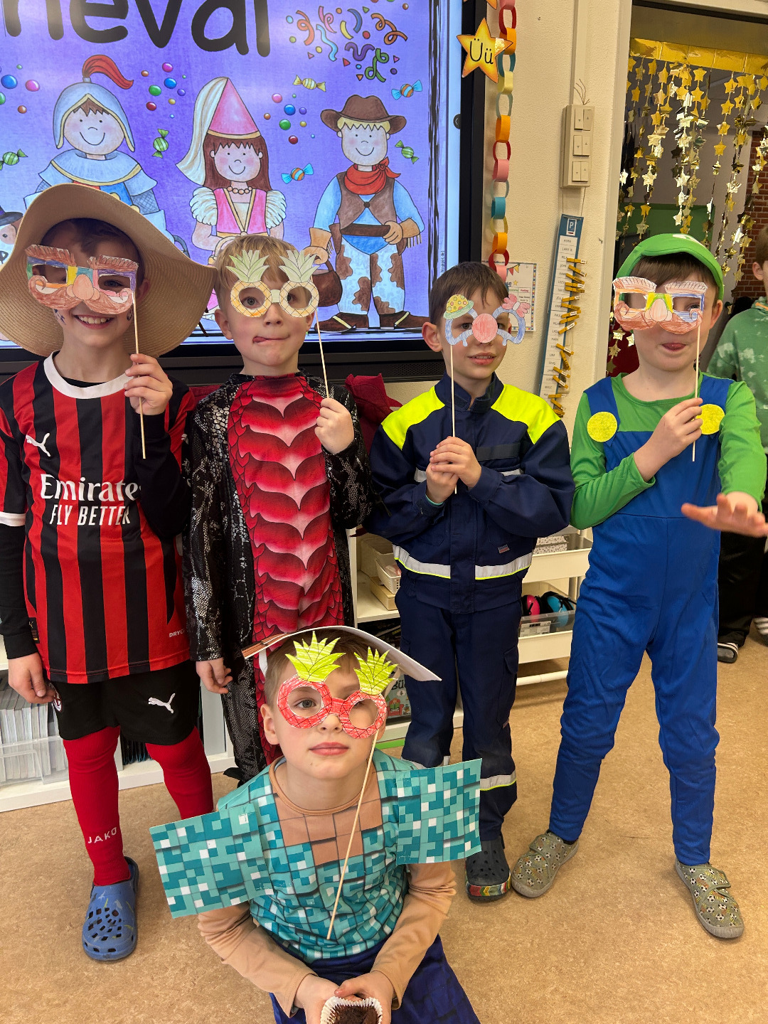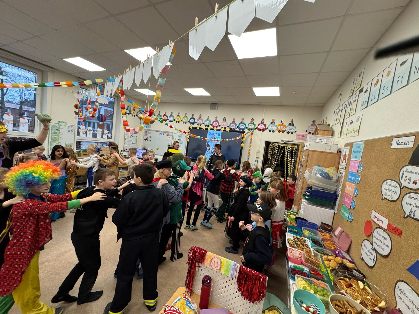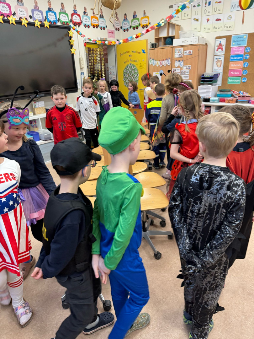 Heute ging es bunt und lustig in unserer Klasse zu! Viele lustige Gestalten liefen herum und feierten ausgelassen zusammen. In unsererm Klassenraum tanzten Cheerleaderinnen, eine Polizistin, zahlreiche Fußballer, ein Feuerwehrmann, viele bunte Schmetterlinge, eine Dame von Welt, ein Marienkäfer, Wednesday, ein Skelett, Hermine Granger, ein Drache, Luigi, Steve, eine Prinzessin, ein FBI-Agent, eine Biene und sogar Schneewittchen herum! Es wurde außerdem gesungen, gebastelt, viiiiiel gegessen und gespielt! Das war ein toller Tag und wir freuen uns schon jetzt aufs nächste Jahr!