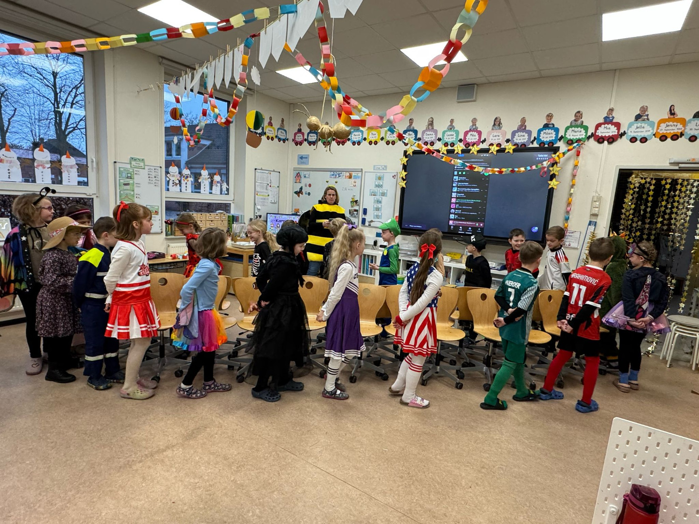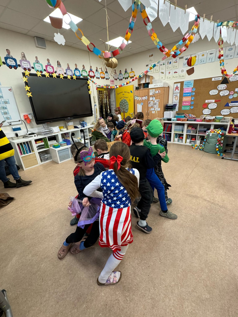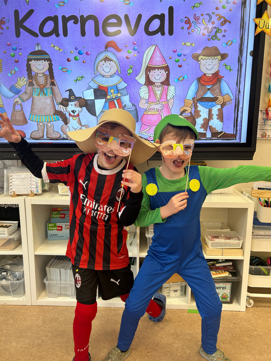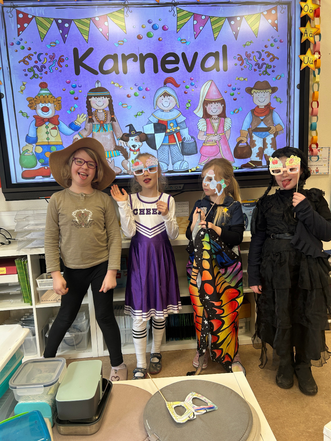 Heute ging es bunt und lustig in unserer Klasse zu! Viele lustige Gestalten liefen herum und feierten ausgelassen zusammen. In unsererm Klassenraum tanzten Cheerleaderinnen, eine Polizistin, zahlreiche Fußballer, ein Feuerwehrmann, viele bunte Schmetterlinge, eine Dame von Welt, ein Marienkäfer, Wednesday, ein Skelett, Hermine Granger, ein Drache, Luigi, Steve, eine Prinzessin, ein FBI-Agent, eine Biene und sogar Schneewittchen herum! Es wurde außerdem gesungen, gebastelt, viiiiiel gegessen und gespielt! Das war ein toller Tag und wir freuen uns schon jetzt aufs nächste Jahr!