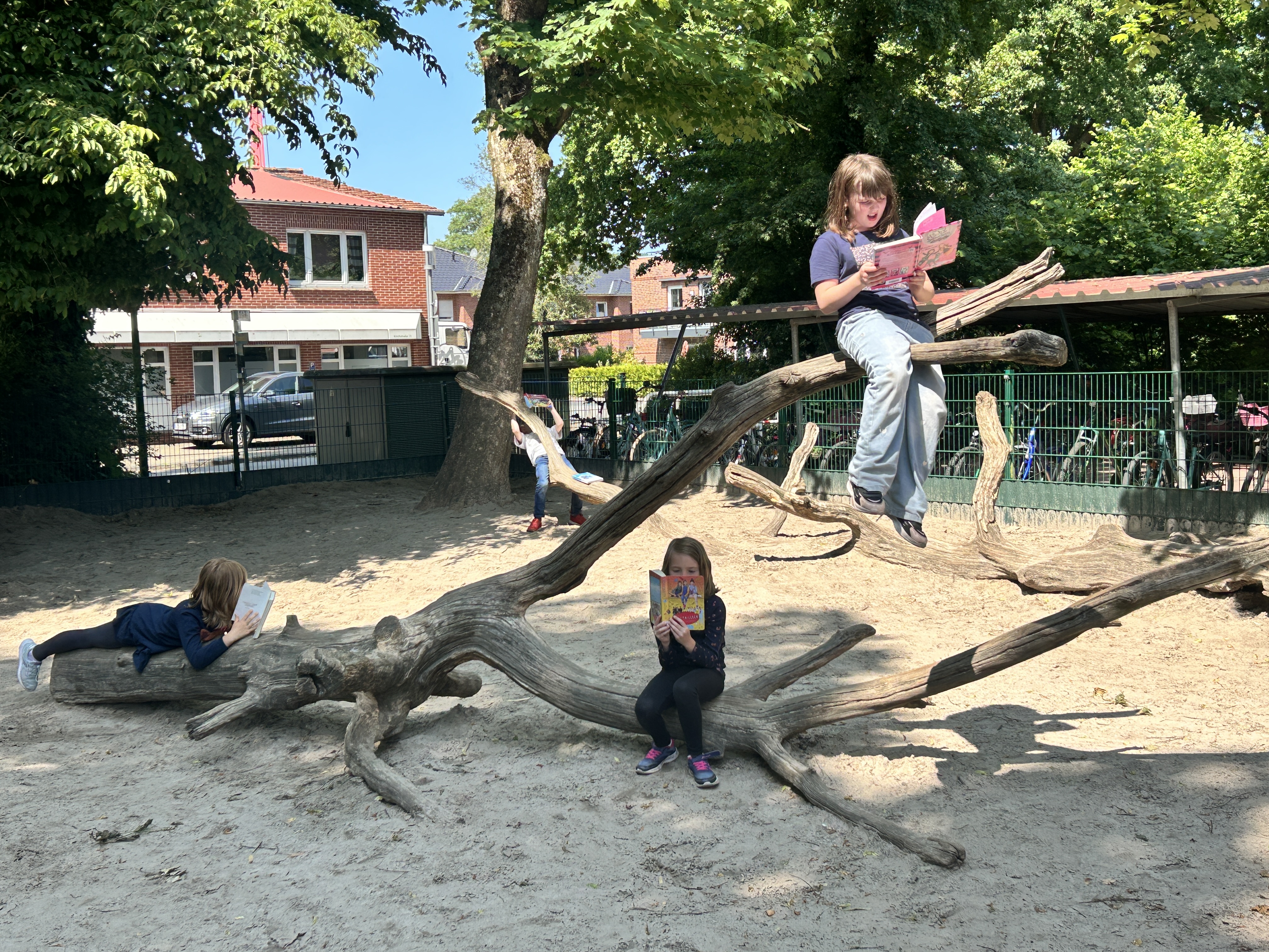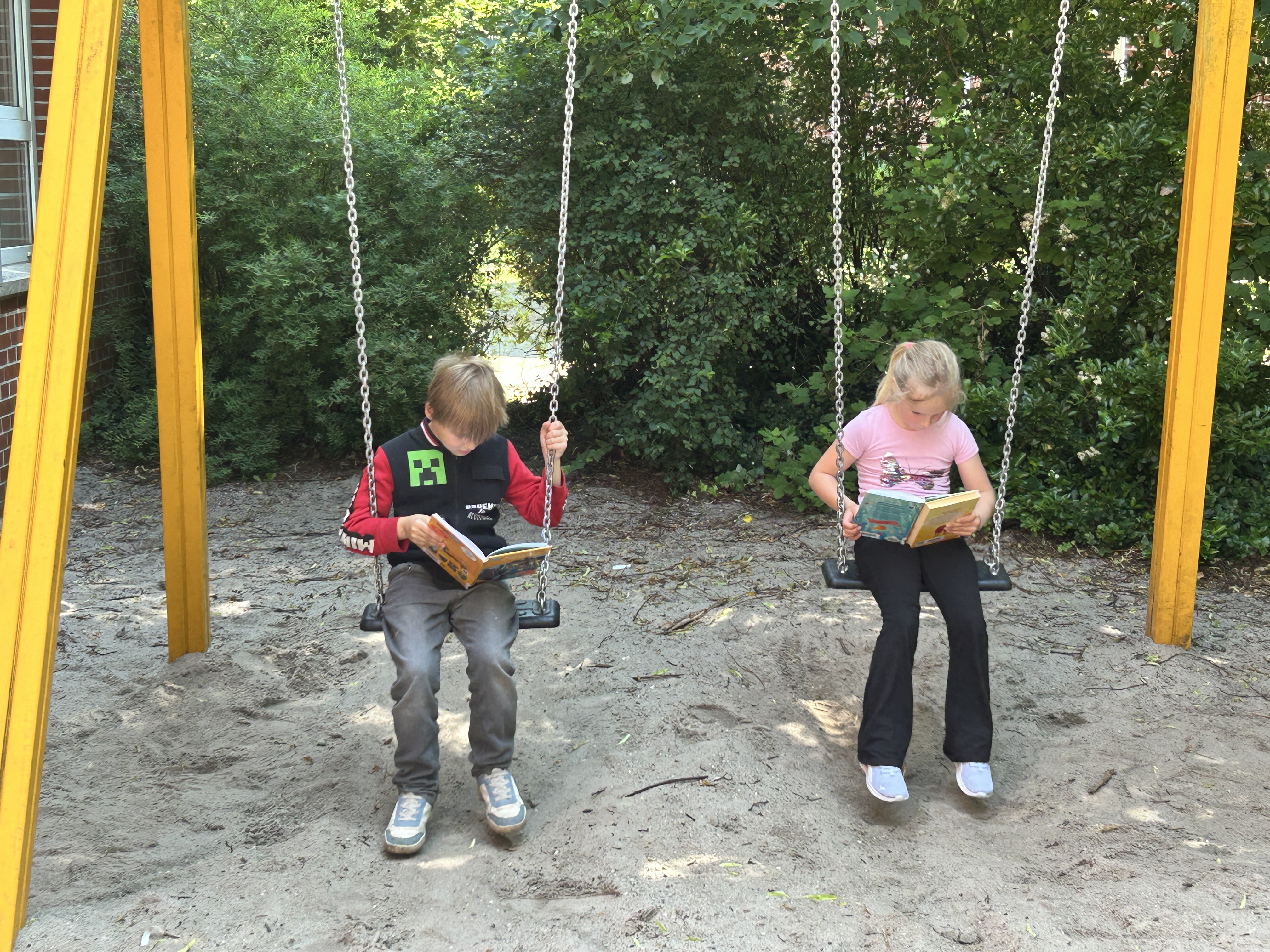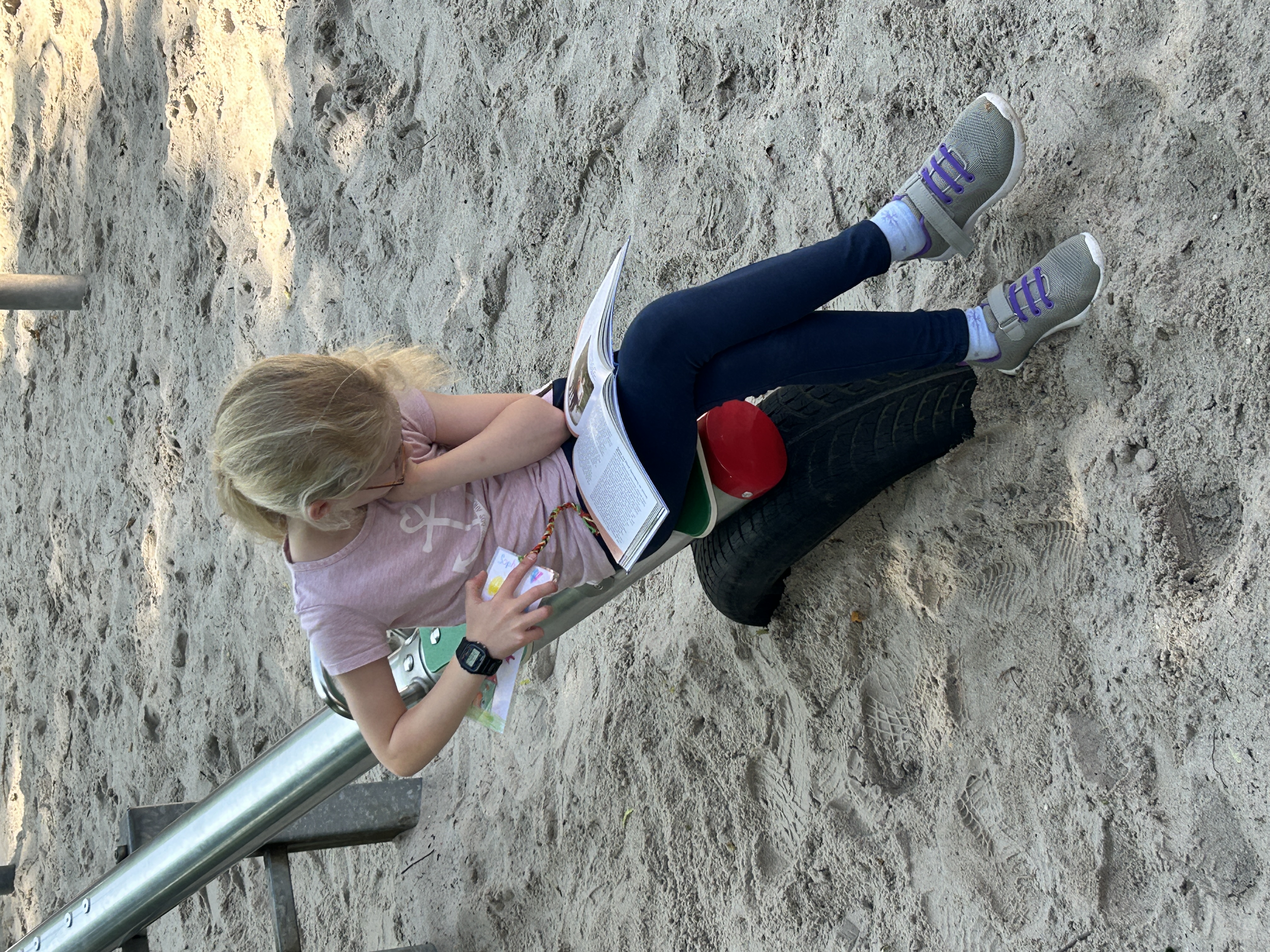 Heute fand unsere Lesezeit mal draußen statt. Nach langem Regen scheint nun endlich wieder die Sonne! Jeder von uns hat sich einen schönen Ort auf dem Schulhof gesucht und dort gelesen. Lesen in der Sonne, im Sand, auf der Kletterpyramide, in der Blätterhöhle oder auf dem Spielturm macht Spaß!