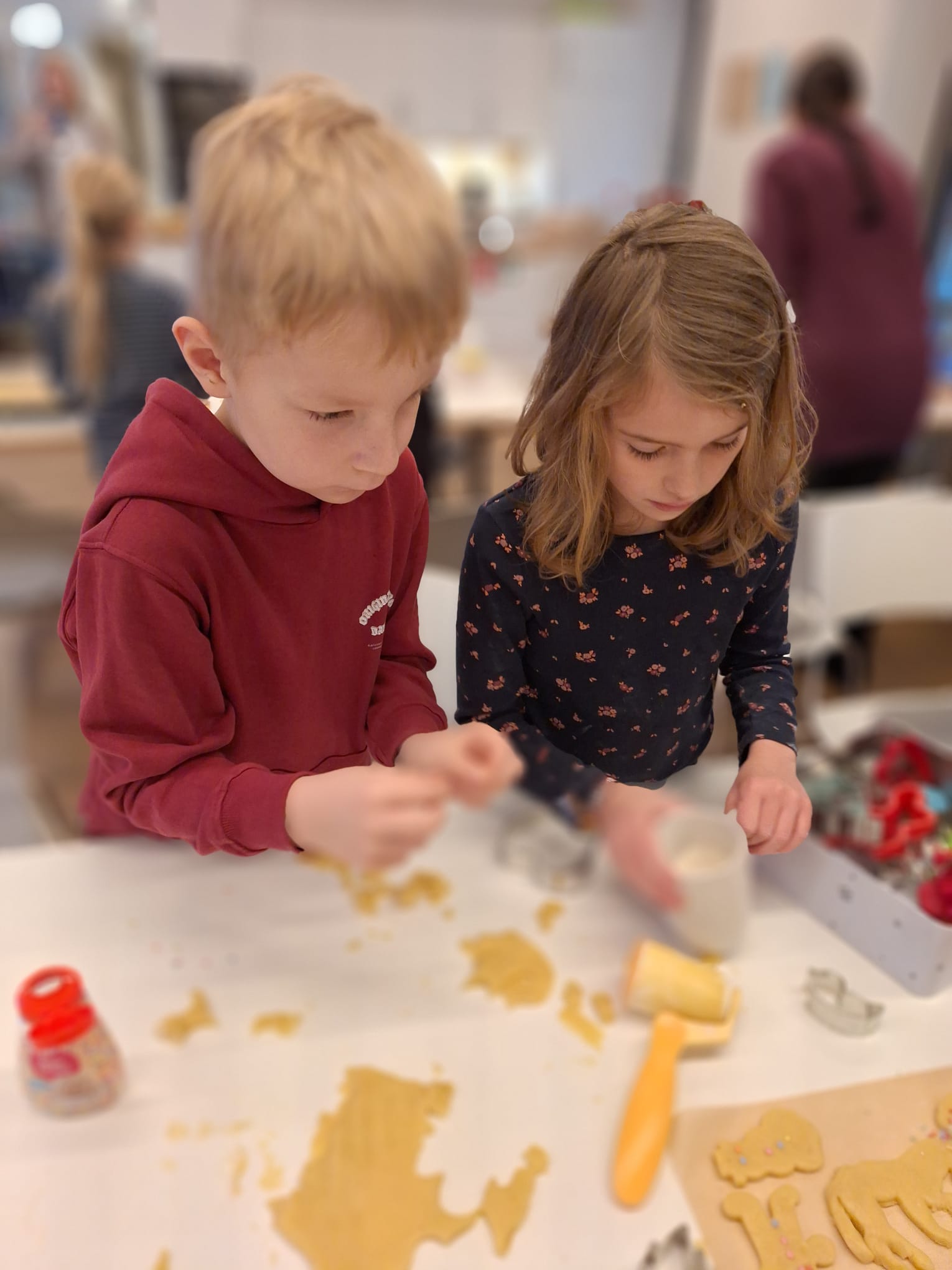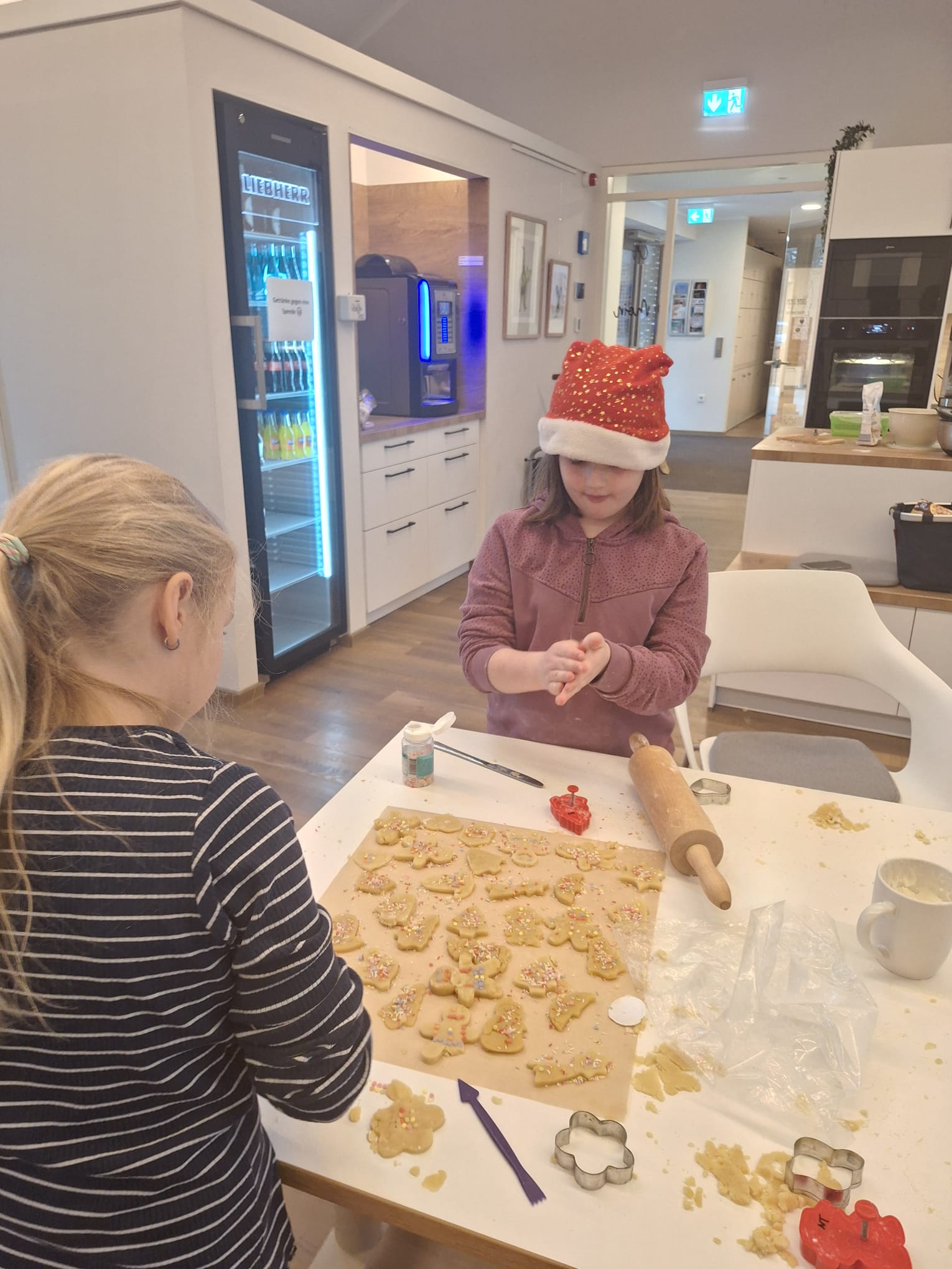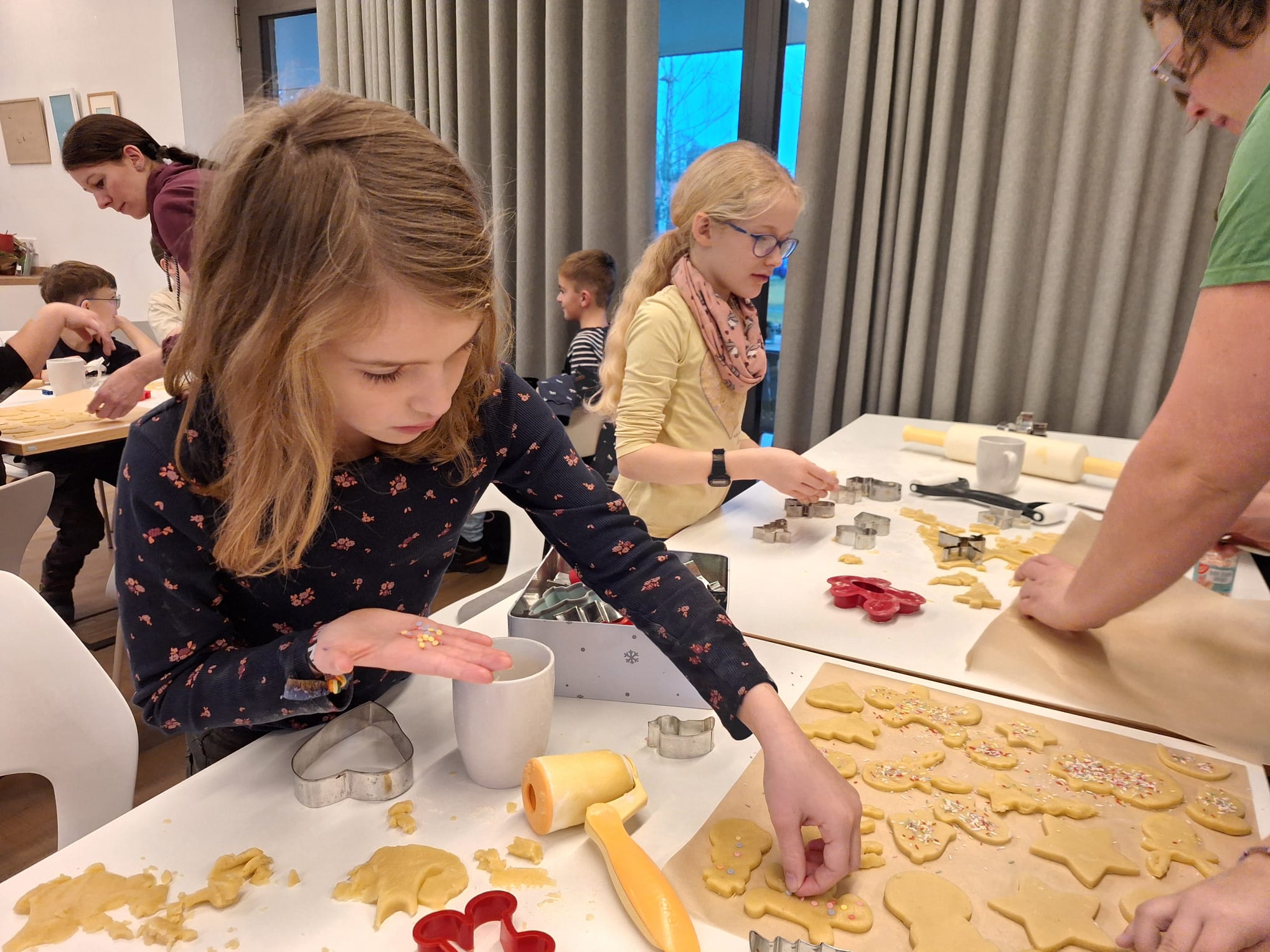 Am vergangenen Freitag haben wir uns auf den Weg zur Upkamer in Remels gemacht, um dort zusammen mit einigen Müttern aus unserer Klasse Kekse zu backen. Wir haben wie die Weltmeister gebacken und hatten viel Spaß beim Ausstechen und Keksteig Naschen. Während die Kekse im Ofen waren, haben wir gespielt oder in aller Ruhe gefrühstückt. Am Ende des Tages gingen wir mit vollen Bäuchen und zehn prall gefüllten Keksdosen zurück zur Schule. Nun können wir jeden Tag im Knusperkreis unsere selbstgebackenen Kekse genießen. Vielen Dank an alle Eltern, die uns an diesem Tag durch einen Teig oder durch Hilfe beim Backen unterstützt haben. Es war ein toller Tag!