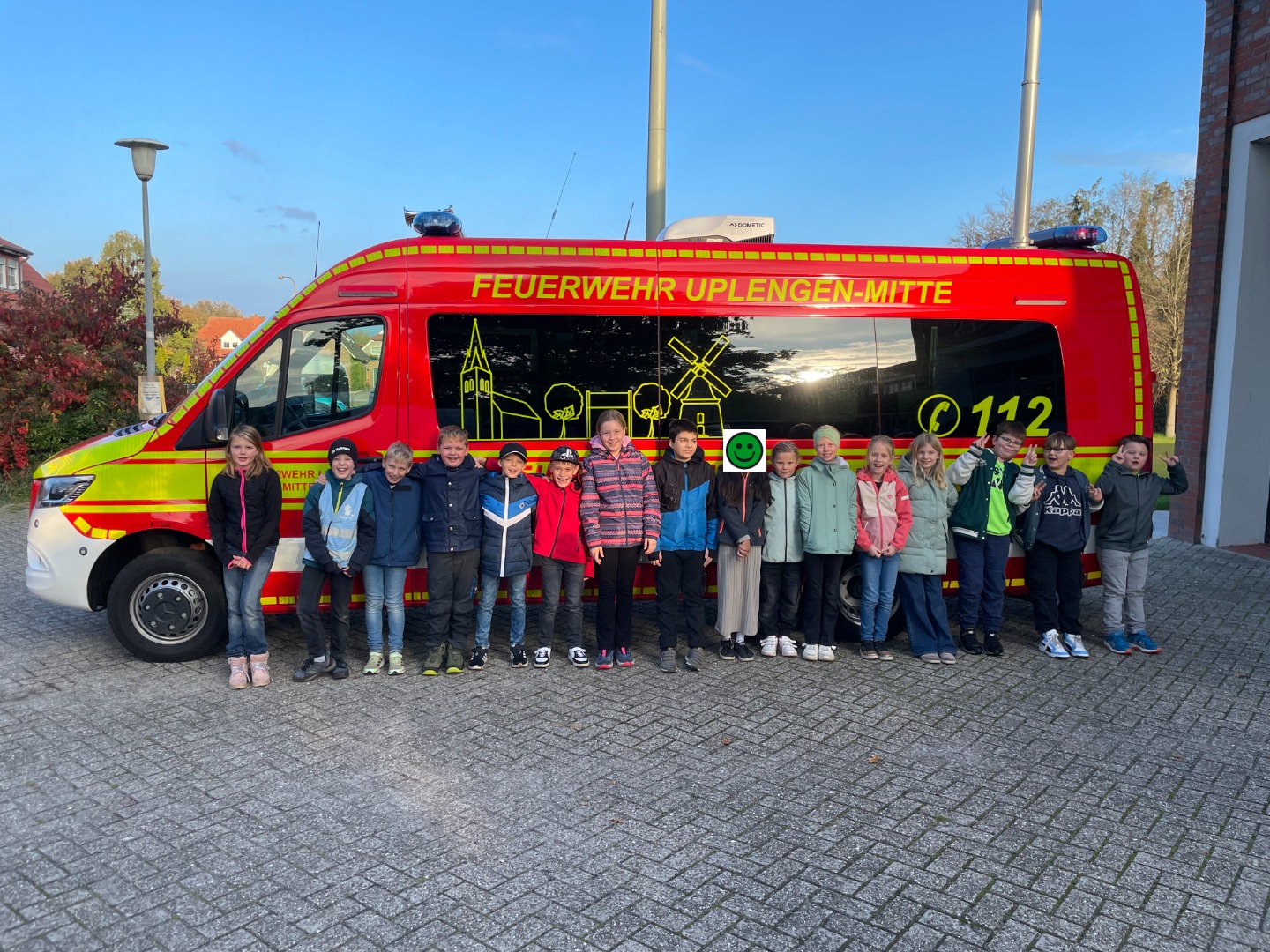Am Freitag durften wir uns bei der Feuerwehr Uplengen-Mitte in Remels umschauen. Wir haben uns das Einsatzleitfahrzeug sowie das große Feuerwehrauto ganz genau angeschaut und konnten dabei viele neue Dinge lernen. Außerdem haben wir uns anhand eines Modells die Rauchentwicklung in einem Haus angeschaut. Gemeinsam haben wir die wichtigsten Dinge zum Verhalten im Brandfall und bei einem Notruf besprochen.