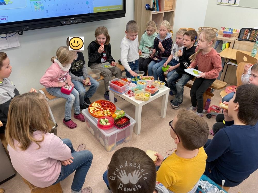 Am Freitag hatten wir unser erstes \Gesundes Frühstück. Viele Kinder haben Obst und Gemüse mitgebracht. Wir hatten so viel Obst und Gemüse, dass wir uns auch nach der Frühstückspause noch öfter bedienen konnten.