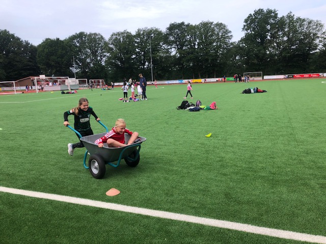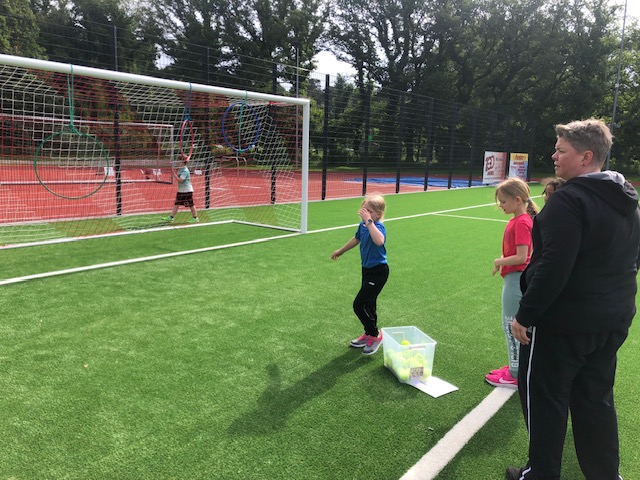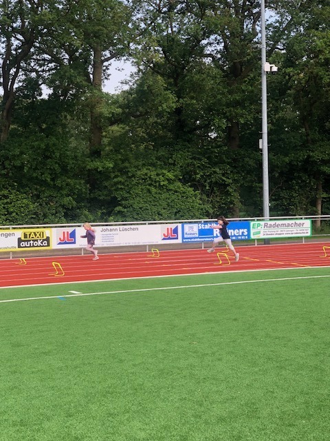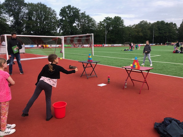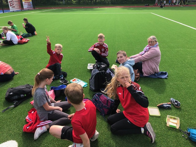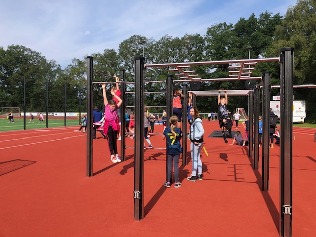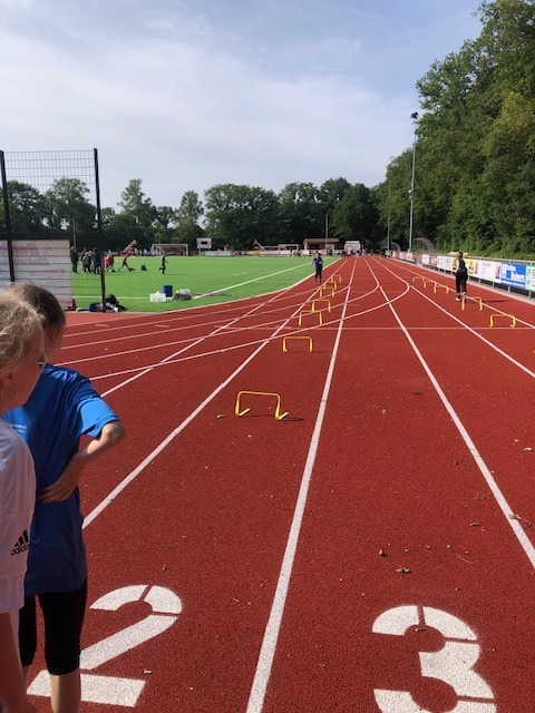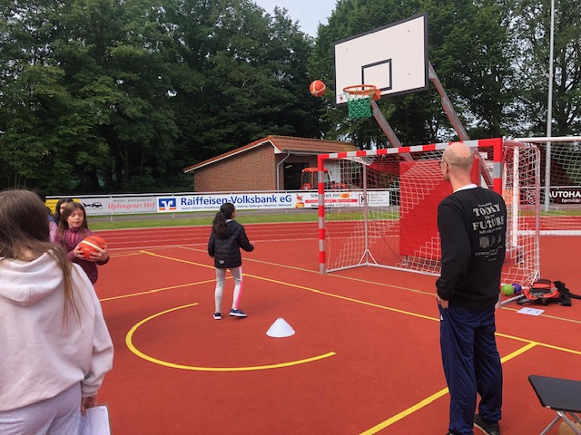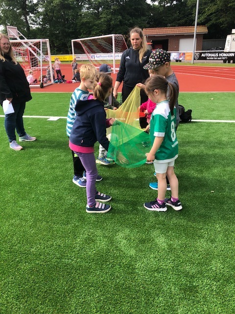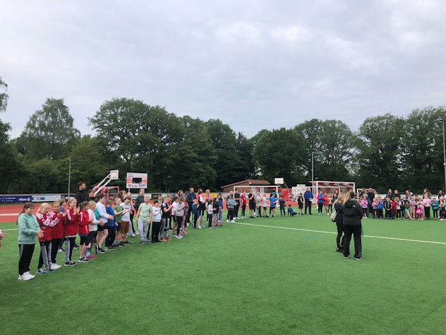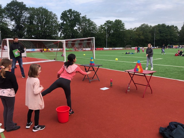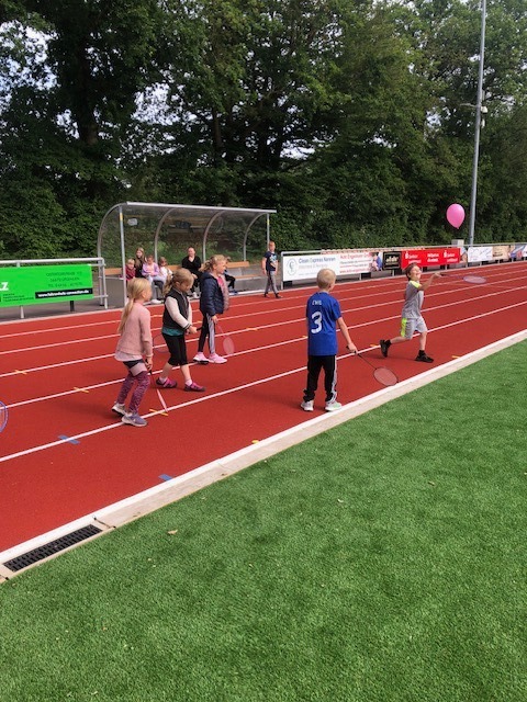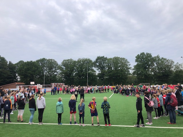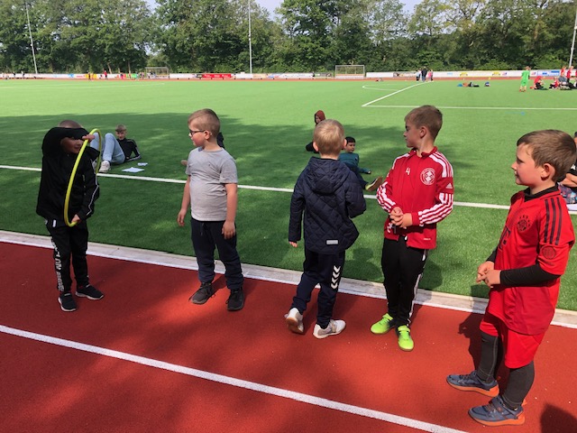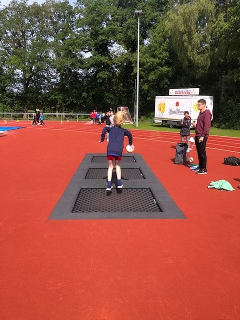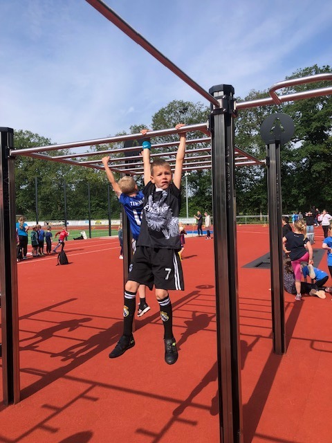 Bei bestem Wetter fand heute das Sportfest der gesamten Grundschule Remels auf dem neuen Sportplatz der Oberschule statt. Um 9 Uhr wurde das Event mit dem Aufwärmlied \'Tanz alles was du hast\' gestartet. Mit ihrer Stempelkarte sind die Kinder als Füchse, Igel, Wale, Hirsche, etc. in Kleingruppen gemeinsam mit einer Begleitperson die verschiedenen Stationen abgelaufen. Insgesamt gab es 16 verschiedene Stationen. Von Sprinten, Zielwerfen, Hangeln, Basketball, Seilhüpfen, Hindernislauf bis Schubkarrenrennen, Tic Tac Toe, Trampolinspringen, Memory-Lauf und Reifenweitergabe war alles dabei. An jeder erfolgreich beendeten Station gab es einen Stempel auf der Stempelkarte. Alle hatten riesigen Spaß. Unterstützung bekamen wir von den Schülerinnen und Schülern der 7. Klasse der OBS. Der Förderverein versorgte alle Sportlerinnen und Sportler mit Getränken, Obst und Brötchen. Vielen lieben Dank an alle fleißigen Helferinnen und Helfer! Das war ein super gelungenes Sportfest für alle Beteiligten!
