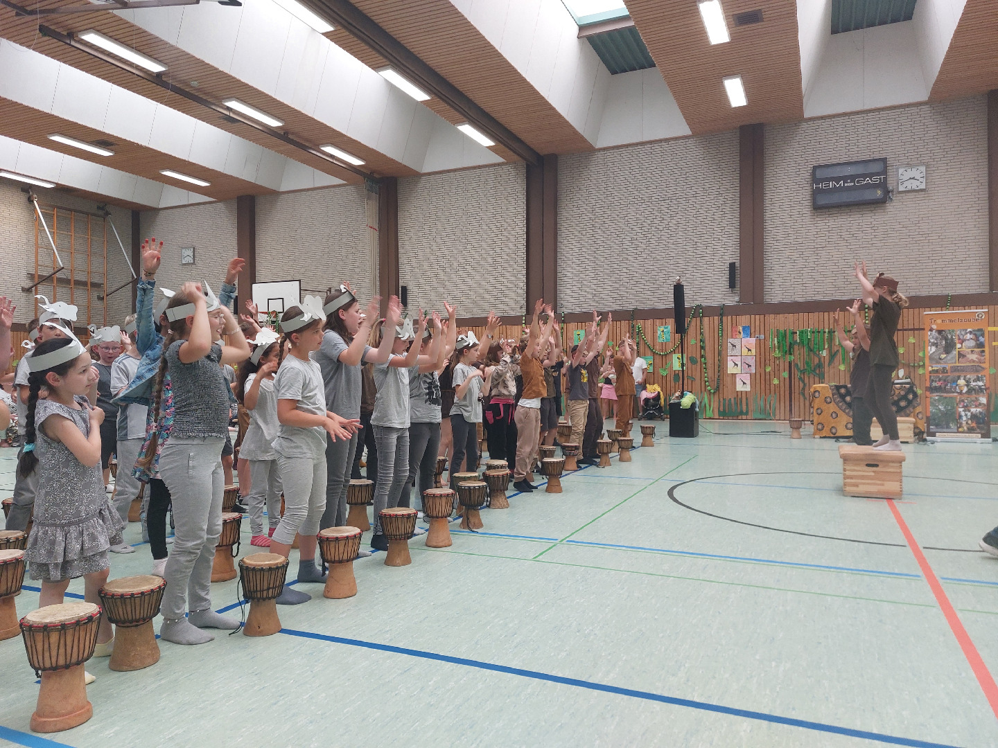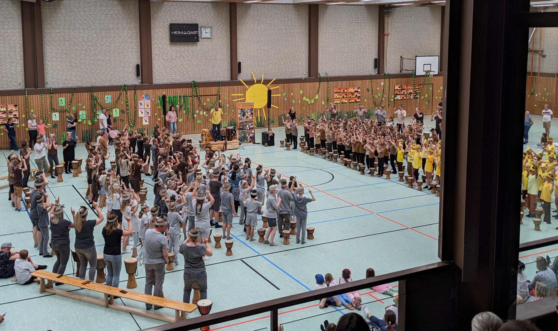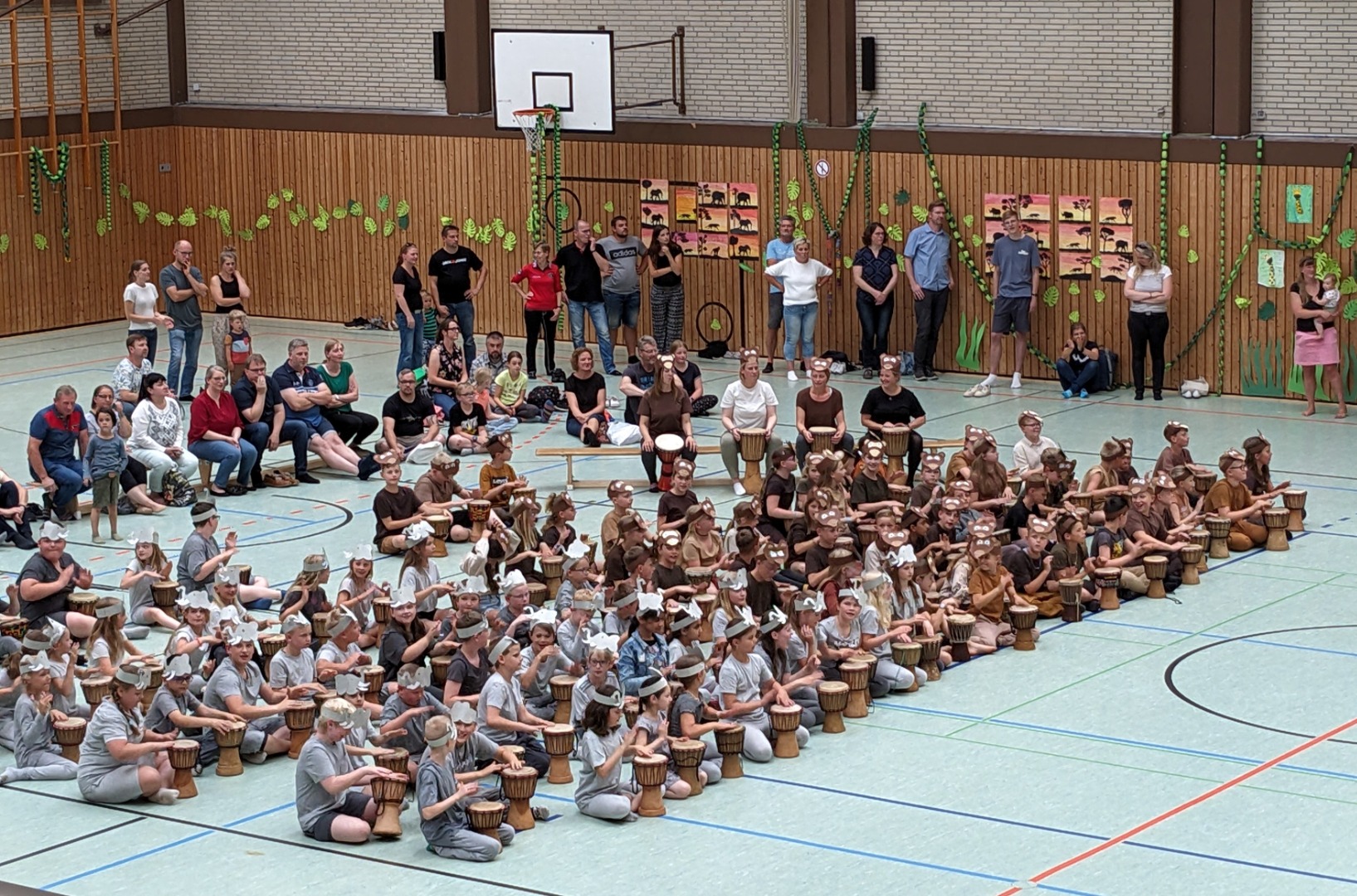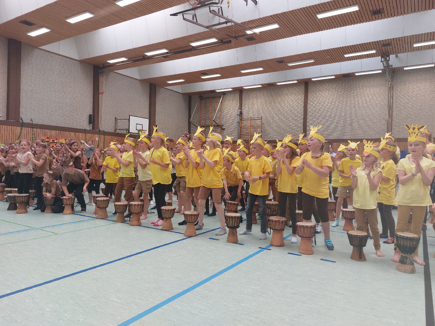 Jeden Tag fand ein gemeinsames Trommeln mit allen Klassen in der Turnhalle statt und außerdem wurde eine Stunde mit der jeweiligen Klassenstufe geprobt. Jeder Jahrgang bereitete sich dort auf seinen eigenen Auftritt mit einem Tanz der Elefanten, Gazellen, Affen oder Giraffen vor. <\/p>\r\n
