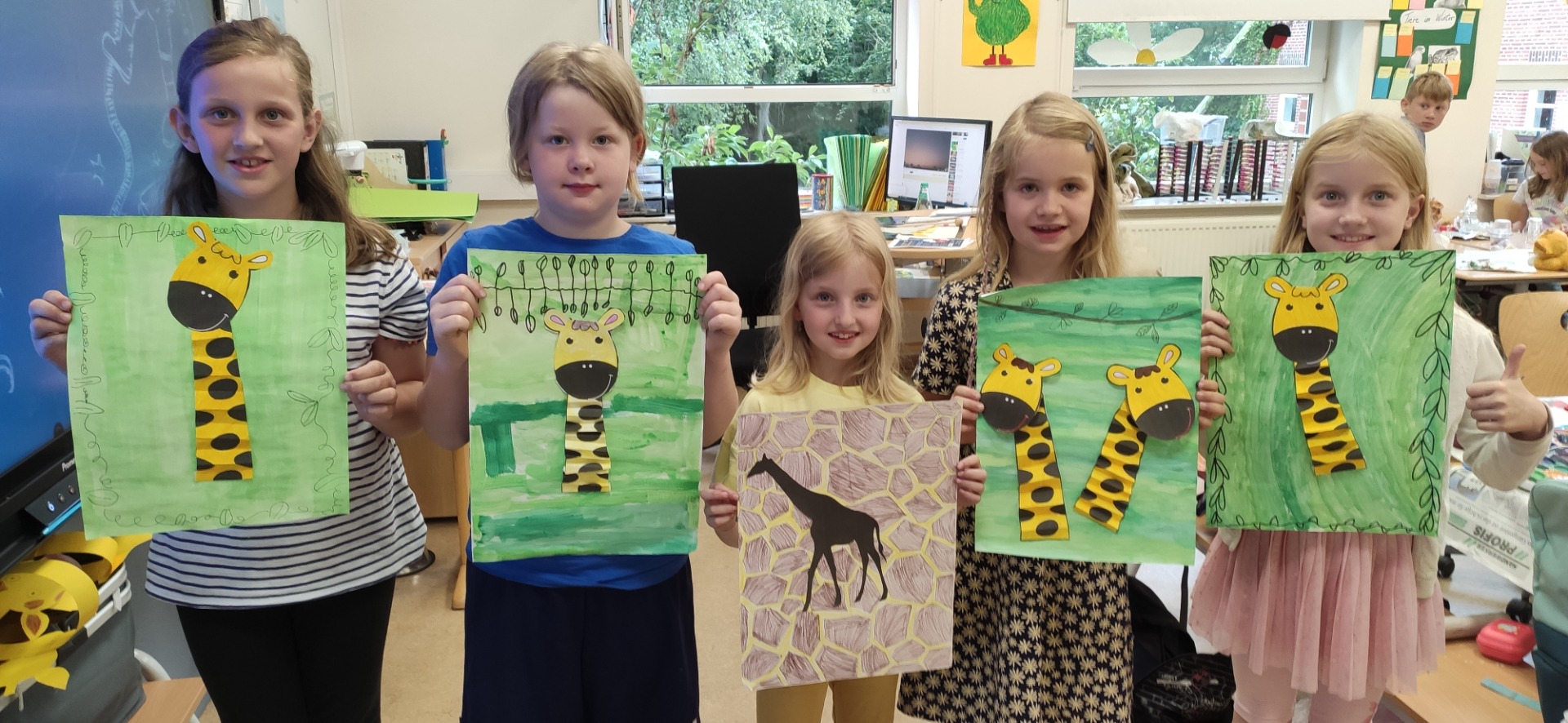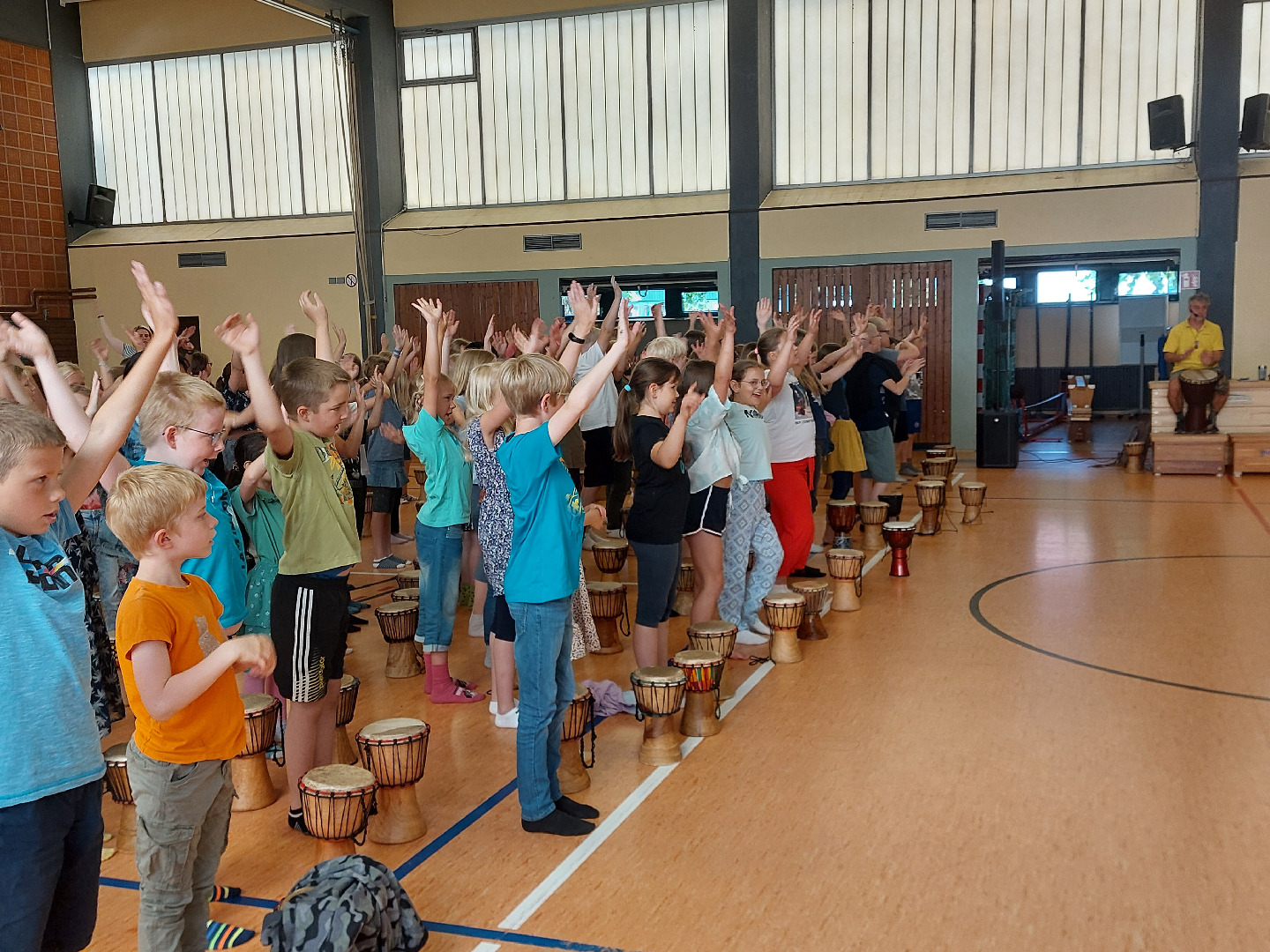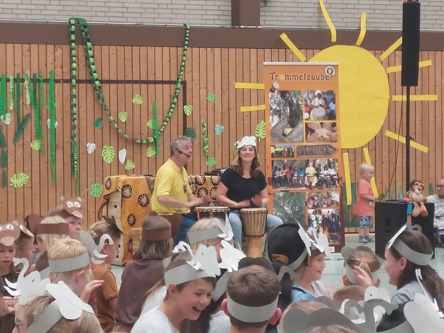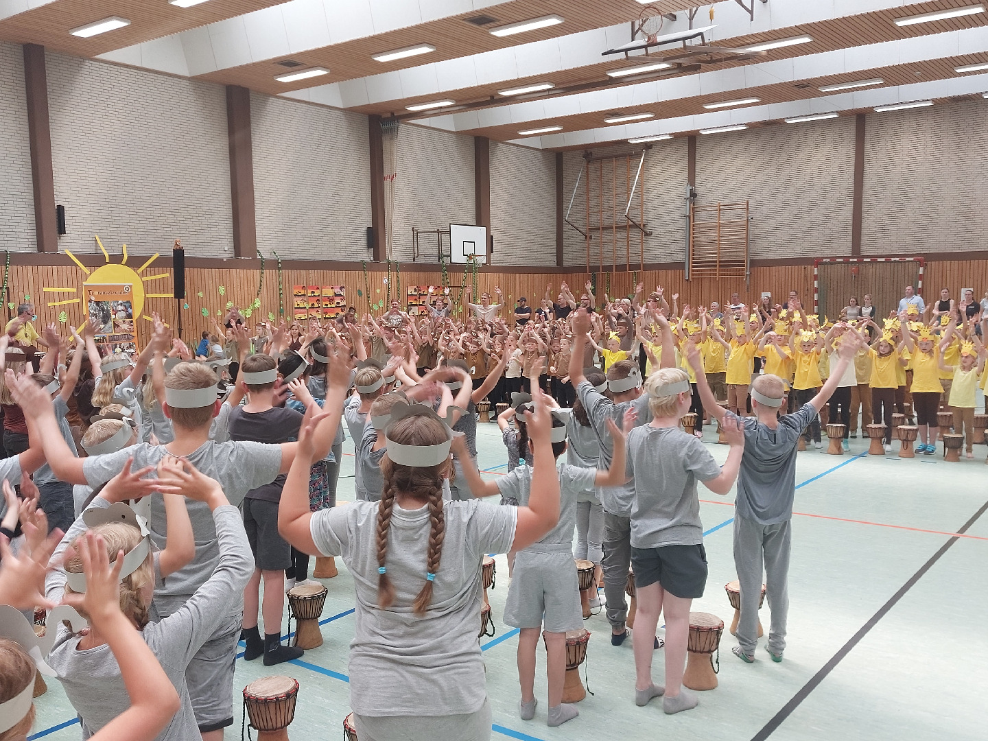 Jeden Tag fand ein gemeinsames Trommeln mit allen Klassen in der Turnhalle statt und außerdem wurde eine Stunde mit der jeweiligen Klassenstufe geprobt. Jeder Jahrgang bereitete sich dort auf seinen eigenen Auftritt mit einem Tanz der Elefanten, Gazellen, Affen oder Giraffen vor. <\/p>\r\n