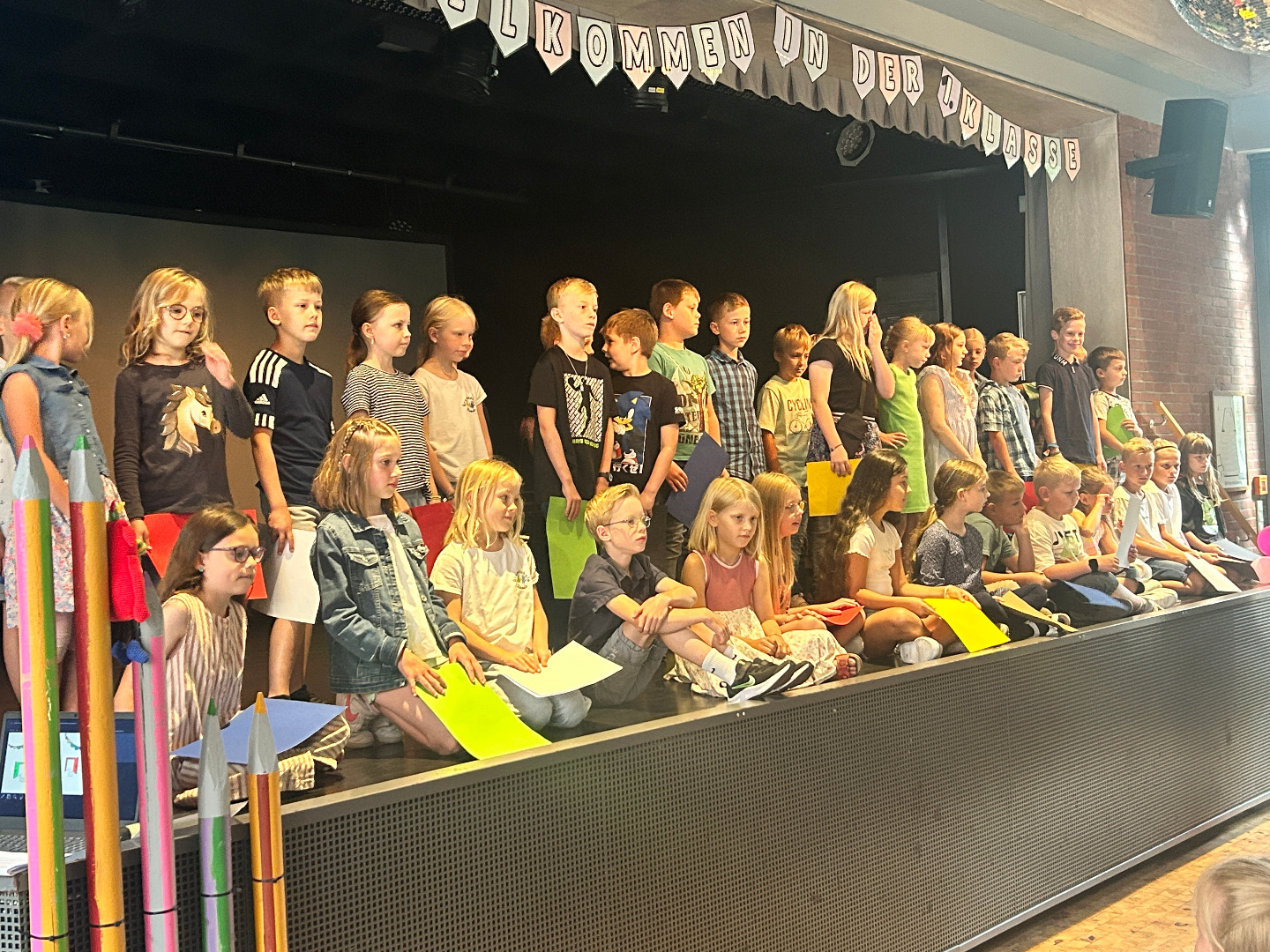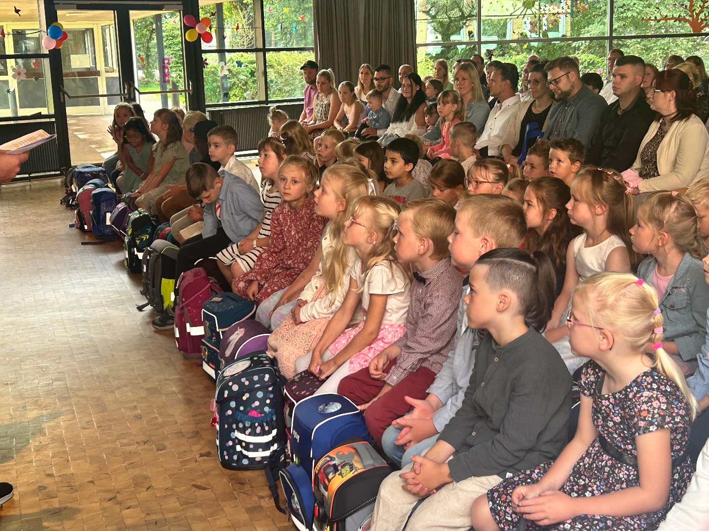 Besonders schön war auch, dass unsere Paten auf der Bühne ein Lied gesungen und uns beim Auszug aus der Aula zum Klassenraum begleitet haben. Dann kam unsere erste Stunde bei den Klassenlehrerinnen. Alle waren ein bisschen aufgeregt, aber es war sehr schön! Später ging es auf den Schulhof, wo unsere Eltern, Großeltern und Freunde schon bei bestem Wetter auf uns warteten.