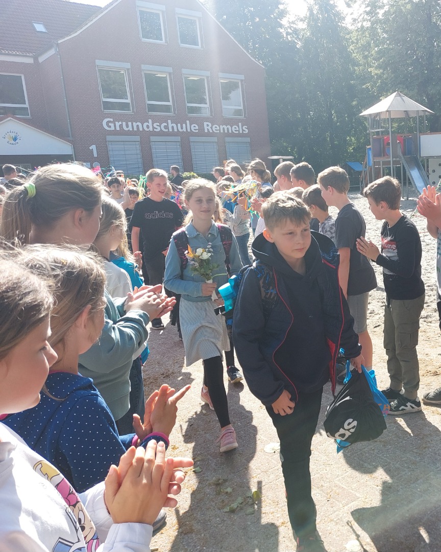 Unter dem Gesang der Schulgemeinschaft: \'Wir sagen euch tschüss und winken dabei und hoffen, dass ihr mal an uns denkt\', wurden am 05.07.2023 die Viertklässler in die verdienten Sommerferien verabschiedet. Man konnte viele grinsende Gesichter beobachten, die unter den bunten flatternden Fahnen der winkenden Grundschülerinnen und Grundschüler hindurchgingen. Aber es waren auch bewegende Momente dabei, wo das ein oder andere Tränchen verdrückt werden musste. Ein hochemotionaler letzter Schultag, mit vielen Geschenken, schönen Worten, herzlichen Umarmungen und strahlenden Augen endete mit dem Gang durch das Spalier. Das Abenteuer Grundschule geht zu Ende und wir werden garantiert noch oft an die vielen wunderbaren Momente mit den Schulabgängern zurückdenken. Das Abenteuer Grundschule ist für euch nun zu Ende und es erwartet euch eine neue spannende Zeit, die wieder neue Herausforderungen und unvergessliche Ereignisse für euch bereit halten wird. <\/p>\r\n